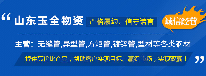 山東玉全物資有限公司主要銷售無縫管,異型管,方矩管,鍍鋅管,型材、鋼管切割加工等系列產品。我公司已與眾多大型原材料廠建立了長期合作共贏的關系,為客戶提供充足的貨源。 公司主要從事管材的銷售,產品有涉及:無縫管,異型管,方矩管,鍍鋅管,型材、鋼管切割加工等。產品廣泛用于化工、電廠、建筑工地、城市建設、汽車等行業??蛻舾采w了國內24個省、市、自治區;并遠銷香港、臺灣、日本、韓國、澳大利亞、菲律賓、新加坡、埃及、伊拉克等20多個國家和地區。憑借優質的產品和服務,深受國內外客戶的信任和好評。…
